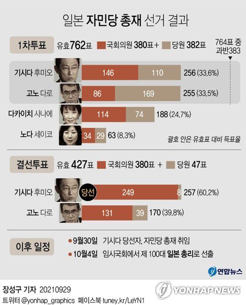 기시다는 결선 투표에서 257표를 획득해 고노 다로(河野太郞) 행정개혁 담당상(170표)을 87표 차이로 눌렀다.
