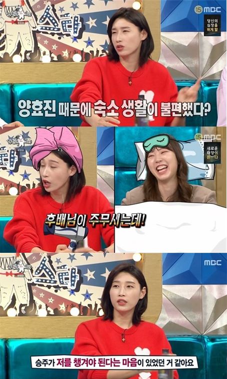 이날 김연경은 “양효진 때문에 숙소생활이 불편했다”고 밝혔다. 그는 “양효진이 밤 11시에 무조건 잔다. 밤 11시에 씻고 나오면 안대 끼고 잘 준비를 하고 있다”고 전했다.