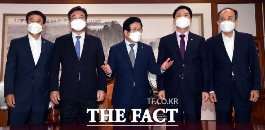 더불어민주당은 29일 오전 까지만 하더라도 여당 단독 통과까지 시사했으나, 돌연 언론중재법 본회의 상정을 포기하고 국민의힘과 협의했다. 민주당이 갑작스레 방향을 바꾸게 된 것을 두고 청와대와 유엔 등 내·외부적으로 있었던 비판때문이라는 분석이 있다. 국회에서 열린 박병석 국회의장 주재 언론중재법 관련 회동을 마친 뒤 의장실을 나서고 있는 여야 원내대표. /이선화 기자 |