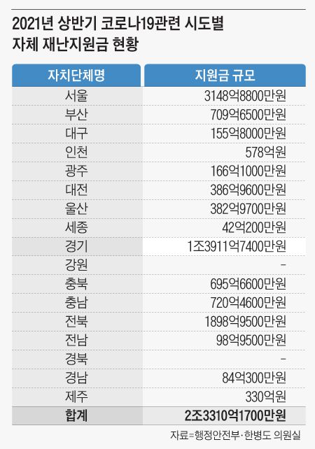 경기도가 올해 상반기에 자체적으로 지원한 코로나 재난지원금 지급 규모가 서울 등 나머지 광역자치단체(14개 시·도)를 모두 합친 것보다 더 큰 것으로 나타났다.