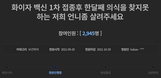 지난 29일 청와대 국민청원 게시판에는 ‘화이자 백신 1차 접종 후 한 달째 의식을 찾지 못 하는 저희 언니 좀 살려주세요’라는 제목의 글이 게재됐다.