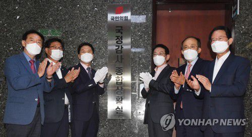 (서울=연합뉴스) 이은정 기자 = 국민의힘은 30일 국정감사 종합상황실 현판식을 열어 문재인 정부의 실정과 이재명 경기지사의 대장동 의혹을 속속 파헤치겠다고 별렀다.