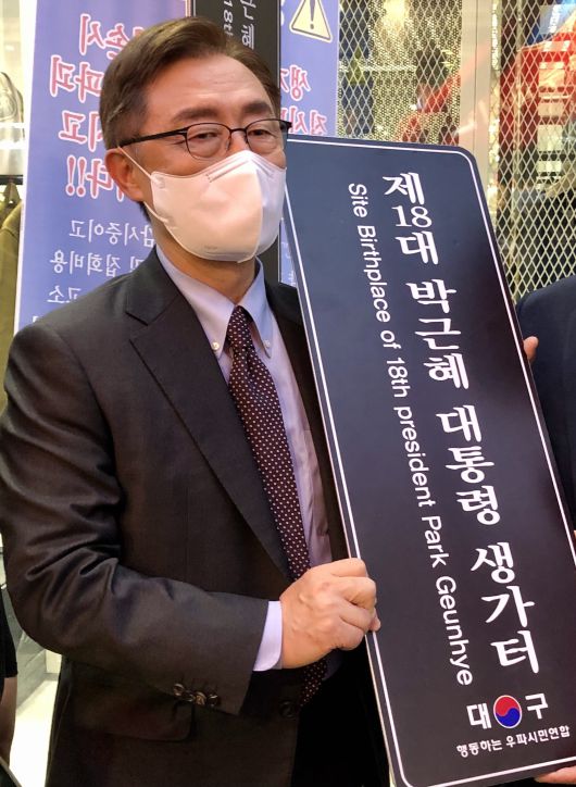 국민의힘 대선 주자인 최재형 전 감사원장이 30일 오후 대구 중구 삼덕동 박근혜 전 대통령 생가터를 찾아 현판을 들어보이고 있다. 뉴스1 |