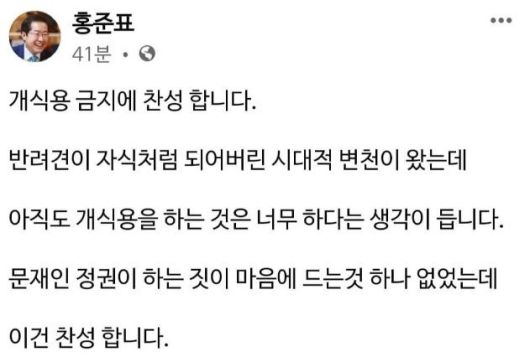 홍준표 의원은 30일 자신의 페이스북을 통해 “개 식용 금지에 찬성한다”라며 “반려견이 자식처럼 되어버린 시대적 변천이 왔는데 아직도 개 식용을 하는 것은 너무하다는 생각이 든다. 문재인 정권이 하는 짓이 마음에 드는 것 하나 없었는데 이건 찬성한다”라고 했다.