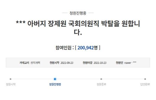[이데일리 이세현 기자] 장제원 국민의힘 의원 관련 국회의원직 박탈을 요구하는 청와대 국민청원 동의 수가 20만을 돌파했다.