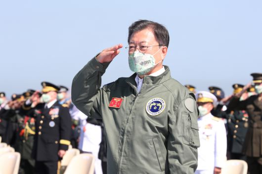 문 대통령은 아울러 “국민의 생명과 안전을 위협하는 그 어떤 행위에 대해서도 정부와 군은 단호히 대응할 것”이라며 굳건한 안보태세도 강조했다. 또 한미 미사일지침 폐지에 따른 신형 미사일 개발 및 실전배치와 잠수함발사탄도미사일(SLBM) 장착 잠수함, 차세대 한국형전투기 KF-21 보라매 등을 언급하면서 “평화의 한반도를 만들어내겠다는 우리 군의 혁신이 오늘 우리 국방력을 세계 6위까지 올려놓았다”고 했다.