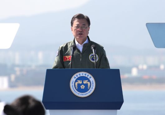 문 대통령은 이날 오전 경상북도 포항시 영일만 앞바다 마라다호 선상에서 열린 제73주년 국군의날에서 축사를 통해 "나는 우리의 든든한 안보태세에 자부심을 갖고 있다"며 "이러한 신뢰와 자부심을 바탕으로 한반도 종전선언과 '화해와 협력의 새로운 시대'를 국제사회에 제안한 것"이라고 말했다.