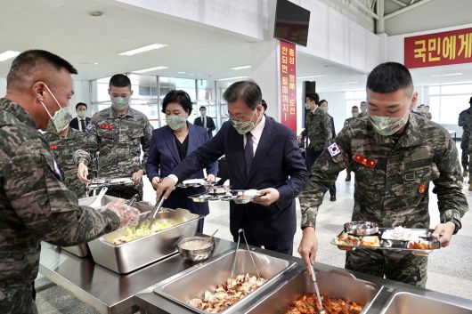 박경미 청와대 대변인은 1일 브리핑을 통해 "문 대통령 내외가 1일 해병대 제1사단 교육훈련단 식당에서 진행된 장병 격려 오찬에 참석했다"고 밝혔다. 박 대변인은 "오늘 오찬에는 병영식당 메뉴 외에도 청와대 셰프가 조리한 '닭다리살 유자간장구이'와 '색동채소 해산물볶음'이 추가로 제공됐다"고 밝혔다.