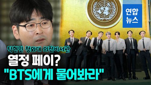 (서울=연합뉴스) 탁현민 청와대 의전비서관은 1일 '방탄소년단(BTS) 열정페이' 논란이 벌어진 것과 관련, BTS 측이 "정말 열심히 노력했는데 너무 아쉽다"는 입장을 밝혀왔다고 전했습니다.