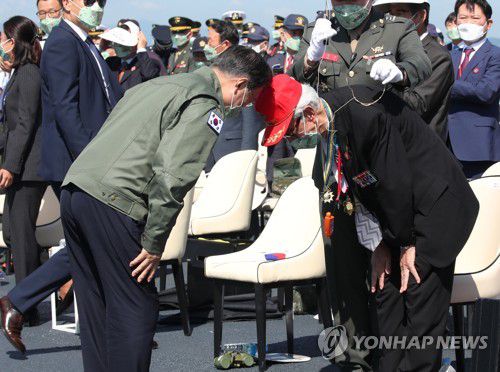 (서울=연합뉴스) 임형섭 기자 = 문재인 대통령이 퇴역한 노병을 만나 허리를 숙였다.