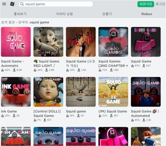 넷플릭스에 공개된 지 보름 남짓 지났지만 전 세계적으로 인기몰이 중인 상황을 반영하듯 지난달 30일 현재 로블록스에서 공유되고 있는 이용자 제작 게임을 보면 'Squid Game(오징어 게임)'을 직접 언급하거나 이를 떠올리게 하는 형태의 게임이 어림잡아 300개가 넘는다.