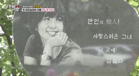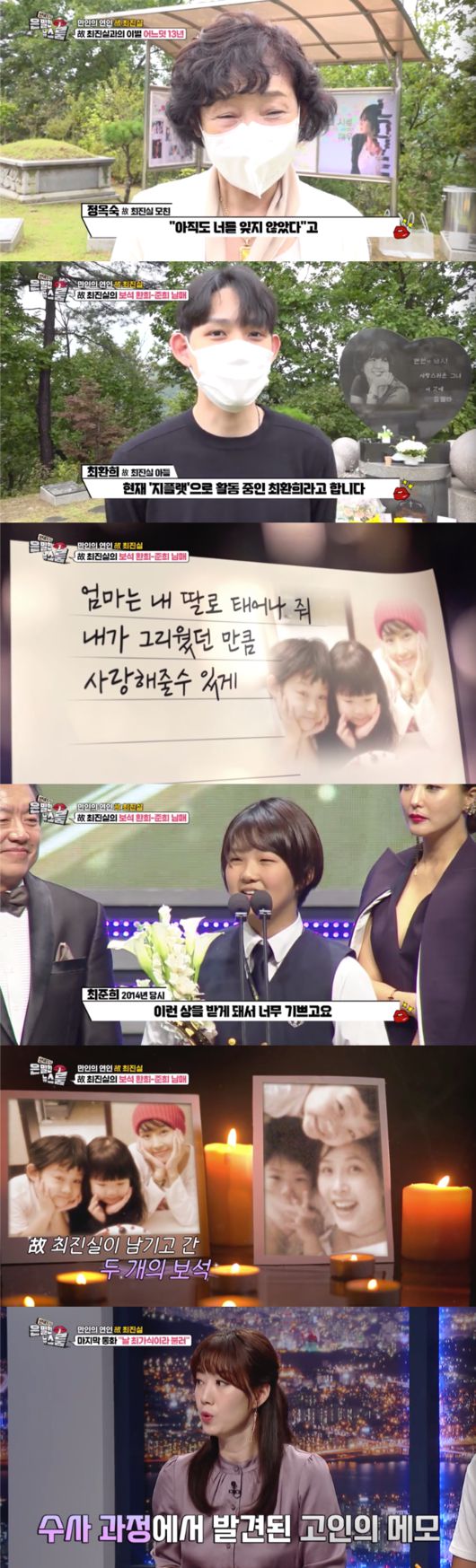 하지만 지난 2008년 10월 2일, 최진실은 스스로 생을 마감해 전 국민을 충격에 빠뜨렸다. 패널은 “경찰이 고인의 메모를 공개했다. ‘나는 왕따 외톨이, 도무지 숨을 쉴 수가 없다’고 적혀 있었다. 지인과 나눈 마지막 통화에서는 ‘내 이름은 최진실인데 사람들은 날 최가식이라고 부른다’고 말했다더라”고 밝혀 많은 이들을 안타깝게 했다.