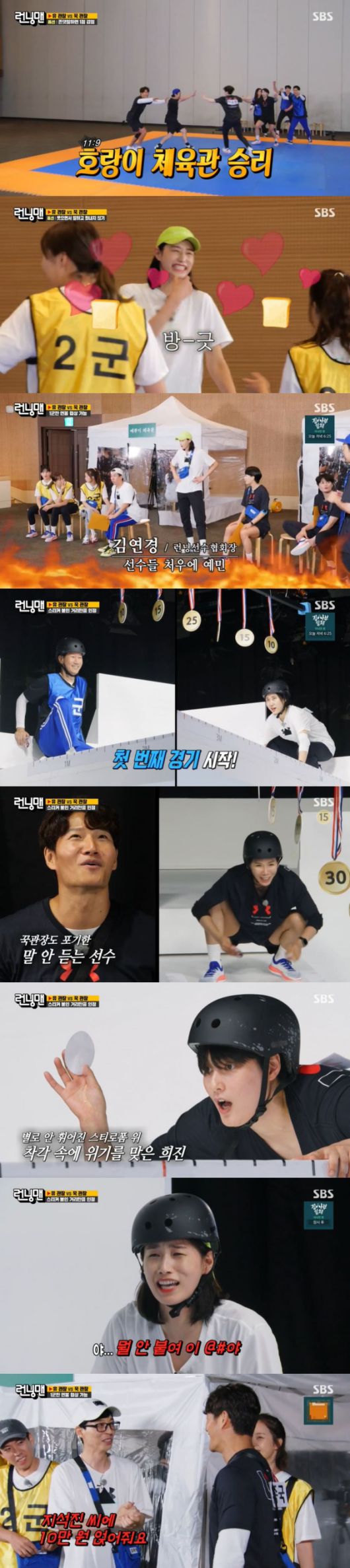 한편 유 관장 팀과 김 관장 팀은 다리 위 스티커 붙이기 대결을 펼쳤다. 염혜선의 활약으로 유 관장 팀은 유리한 고지를 점했다. 김종국 팀 오지영은 팀원들의 만류에도 점프를 시도했으나 붙이지 못하고 낙하했다. 오지영과 인터뷰한 하하는 "창피하대요"라고 밝혀 웃음을 자아냈다.