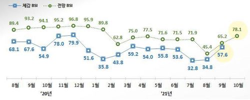 체감 BSI는 지난 6월 53.6에서 코로나19 4차 대유행 영향으로 7월 32.8로 급락한 데 이어 8월에도 34.8에 머물렀다.