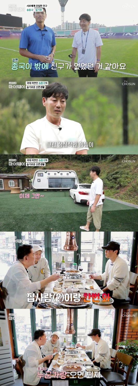 이날 송종국은 경남FC 감독 설기현을 만났다. 두 사람은 1997년 청소년 대표팀에서 만나 우정을 이어온 사이다. 송종국은 "하나 밖에 없는 친구다. 내가 친구가 없다"고 웃어보였다. 설기현 역시 "마음 잘 맞고 성실한 친구"라며 "그때 종국이 밖에 친구가 없었다"고 애정을 드러냈다.