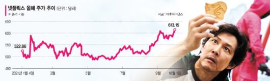 1일 뉴욕증시에서 넷플릭스는 전 거래일 대비 2.81달러(0.46%) 오른 613.15달러에 마감했다. 전날에는 장중 사상 최고치인 619달러를 찍기도 했다. 9월 한달간 상승률은 7.5%에 달한다. 인플레이션과 테이퍼링(자산매입 축소) 우려 등으로 뉴욕증시 주요 3대 지수가 같은 기간 4~5%대 하락한 것과 대조적이다.