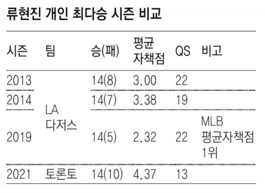 류현진은 4일 토론토 안방에서 열린 메이저리그 볼티모어와의 시즌 최종전에서 선발로 나서 5이닝 6피안타(1홈런) 1볼넷 7탈삼진 2실점을 기록했다. 팀 타선도 류현진을 화끈하게 지원하며 12-4로 대승했다. 류현진은 LA 다저스 시절이던 2013, 2014, 2019시즌에 기록한 개인 최다승 기록인 14승과 타이를 이루며 아메리칸리그(AL) 다승 공동 2위로 시즌을 마무리했다. AL 다승 1위는 16승(8패)을 올린 게릿 콜(뉴욕 양키스).