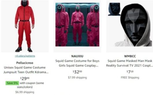 오징어게임 캐릭터의 의상들은 제조사와 브랜드에 따라 조금씩 가격이 다른데 이처럼 다양한 제품이 상품 목록을 차지하고 있다는 것은 오징어게임에 대한 대중의 관심과 소비가 늘었다는 의미다.