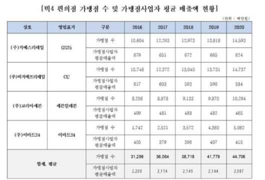 5일 국회 정무위원회 소속 윤관석 의원(더불어민주당)이 공정거래위원회로부터 받은 ‘빅4 편의점 가맹본부 매출액 및 가맹점 매출액 현황’ 자료에 따르면 지난해 GS25·CU·세븐일레븐·이마트24 등 주요 4개 편의점 본사의 평균 매출액은 20조4316억원으로 파악됐다.