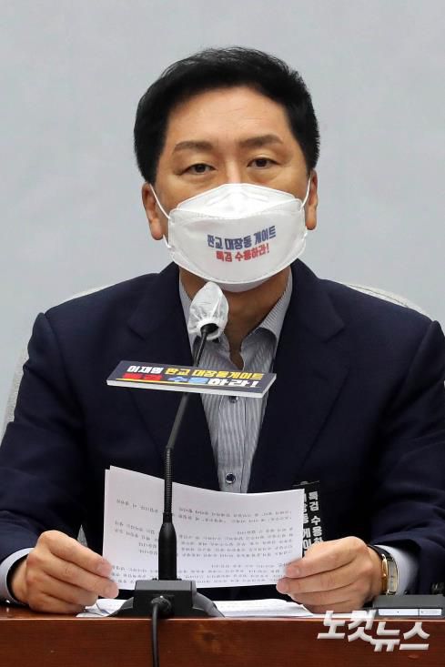 5일 국회에서 열린 국민의힘 국정감사대책회의에서 김기현 원내대표가 발언을 하고 있다.이날 참석자들은 대장동 개발 특혜 의혹 관련 특검을 요구하는 마스크와 리본을 부착하고 회의에 참석했다.저작권자 © CBS 노컷뉴스 무단전재 및 재배포 금지