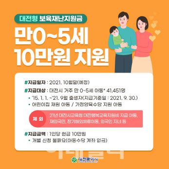 [대전=이데일리 박진환 기자] 대전시는 코로나19 장기화로 어려움을 겪는 영유아 및 보호자들을 위해 1인당 10만원의 보육재난지원금을 지급한다고 5일 밝혔다. 지원대상은 2021년 9월 기준 주민등록상 대전시 거주자 중 만 0~5세(2015년 1월~2021년 9월 출생자) 아동이다. 다만 대전시교육청의 대전행복교육지원비를 지원받는 아동 및 재외국민 아동, 장기해외체류아동, 외국인 자녀 등은 제외된다. 현재 주민등록 기준으로 대전시 만0~5세 지원 대상 아동은 4만 2000여명이다. 지급대상자 확정 후 이달 중 지급 예정이며, 아동 보호자의 방문신청 및 접수에 따른 불편해소와 코로나19 확산방지를 위해 신청 없이 기존 아동수당 지급계좌로 지급한다. 강병선 대전시 가족돌봄과장은 “이번 보육재난지원금 지원으로 코로나19 장기화로 힘든 시간을 보내고 있는 영유아 및 보호자들에게 조금이나마 위안이 될 수 있기를 바란다”고 말했다.