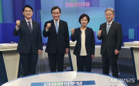 [서울=뉴시스] 국회사진기자단 = 더불어민주당 대선 경선 후보들이 30일 서울 중구 TV조선에서 열린 방송토론회에 앞서 포즈를 취하고 있다. 왼쪽부터 박용진, 이낙연, 추미애, 이재명 후보. 2021.09.30. photo@newsis.com |