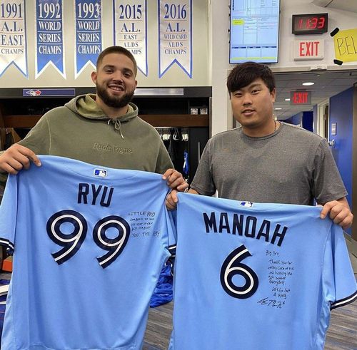 (서울=연합뉴스) 신창용 기자 = 올 시즌 메이저리그(MLB) 토론토 블루제이스 선발진의 두 기둥인 류현진(34)과 알렉 마노아(23)가 유니폼을 교환하며 남다른 친분을 과시했다.