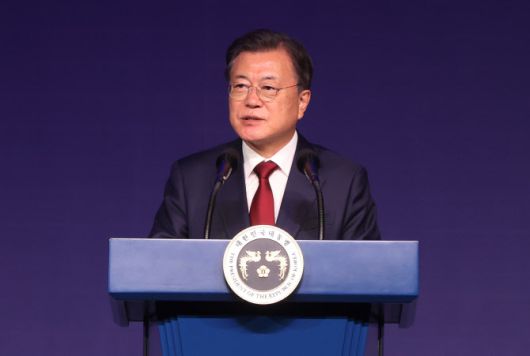 (서울=연합뉴스) 최재구 기자 = 문재인 대통령이 5일 서울 그랜드 워커힐호텔에서 열린 제15회 세계한인의 날 기념식에서 기념사를 하고 있다. 2021.10.5
