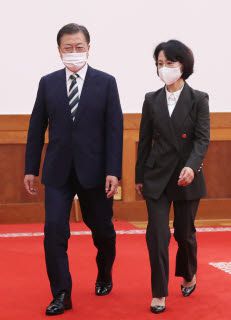 문재인 대통령이 6일 오전 청와대 본관에서 오경미 신임 대법관에게 임명장을 수여하고 환담장으로 이동하고 있다. 연합뉴스 |