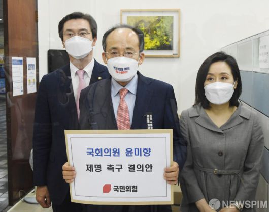 그러면서 "윤미향 의원은 속히 의원직에서 내려와 위안부 할머니들의 후원금을 제 주머니 쌈짓돈처럼 쓴 데 대한 법원의 준엄한 심판부터 받아야 할 것"이라며 "이에 국민의힘은 윤미향 의원이 헌법을 준수하고 국가이익을 위해 양심에 따라 직무를 수행해야 할 국회의원으로서 자격이 없다고 판단하며 국회의원 제명 촉구 결의안을 제출한다"고 밝혔다.