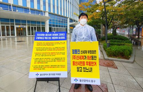 (울산=연합뉴스) 김근주 기자 = 박태완 울산 중구청장이 '울산 중구 혁신도시 부지 내 상업시설 건립'을 촉구하며 6일 서울 이마트 본사 앞에서 1인 시위했다.