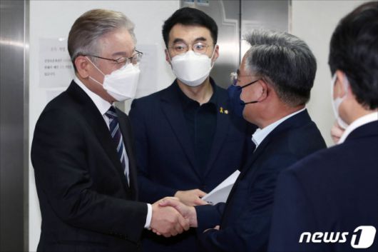 (서울=뉴스1) 구윤성 기자 = 더불어민주당 대선 예비후보인 이재명(왼쪽) 경기도지사가 6일 오후 '대장동 국민의힘 게이트, 열린민주당이 묻고 이재명이 답하다' 유튜브 라이브 방송에 출연하기 위해 서울 여의도 열린민주당 당사를 방문하고 있다. 2021.10.6/뉴스1 |