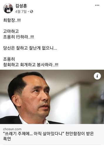 해군 중위 출신인 김씨는 지난 4월 SNS에서 최 전 함장에게 "고마(그만)하고 조용히 하라. 당신은 잘하고 잘난 게 없으니"라며 "조용히 참회하고 회개하고 봉사하라"라고 맹비난했다.
