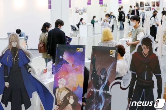 (고양=뉴스1) 민경석 기자 = 7일 오후 경기 고양 킨텍스에서 열린 '2021 경기국제웹툰페어'를 찾은 관람객들이 웹툰 작품을 둘러보고 있다.이번 전시는 영화, 드라마, 게임 등 콘텐츠 분야에서 이야기의 원천으로 주목받는 웹툰 산업의 활성화를 위해 마련됐다. 2021.10.7/뉴스1newsmaker82@news1.kr[© 뉴스1코리아(news1.kr), 무단 전재 및 재배포 금지]