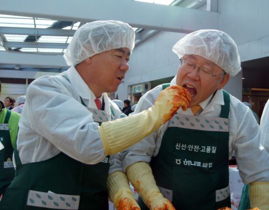 지난 2012년 11월 20일 성남시 농수산물유통센터에서 열린 사랑의 김장김치 나누기 행사에서 이재명 당시 성남시장과 최윤길(왼쪽) 성남시의장이 함께 행사에 참석해 김장김치를 담그고 있다/ 독자제공 |
