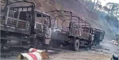 5월 친주 민닷에서 시민무장세력 공격으로 불에 탄 미얀마군 차량들 |