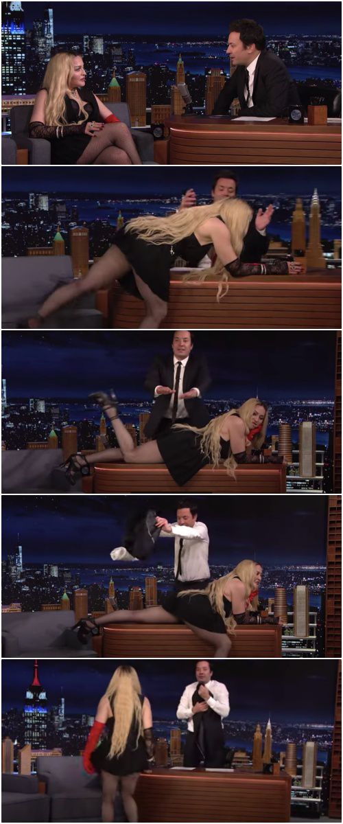 팰런이 "좋은 문제다"라고 말하자 마돈나는 "정말 그렇다"라고 말한 뒤 책상 위에 놓여진 커피잔을 옆으로 밀어내고 그 위로 뛰어들었다. 관객들의 탄생이 터져나왔고 명불허전 글래머러스한 몸매가 돋보였다.