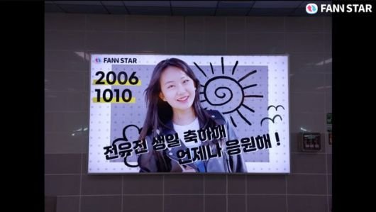 '팬앤스타'는 10일 대구 지하철 1호선 전광판에서 광고 중인 전유진 생일 축하 이벤트 사진을 공개했다. 전유진의 팬들은 지난 8월 13일 오픈된 팬앤스타 '전광판 광고'를 달성했다.