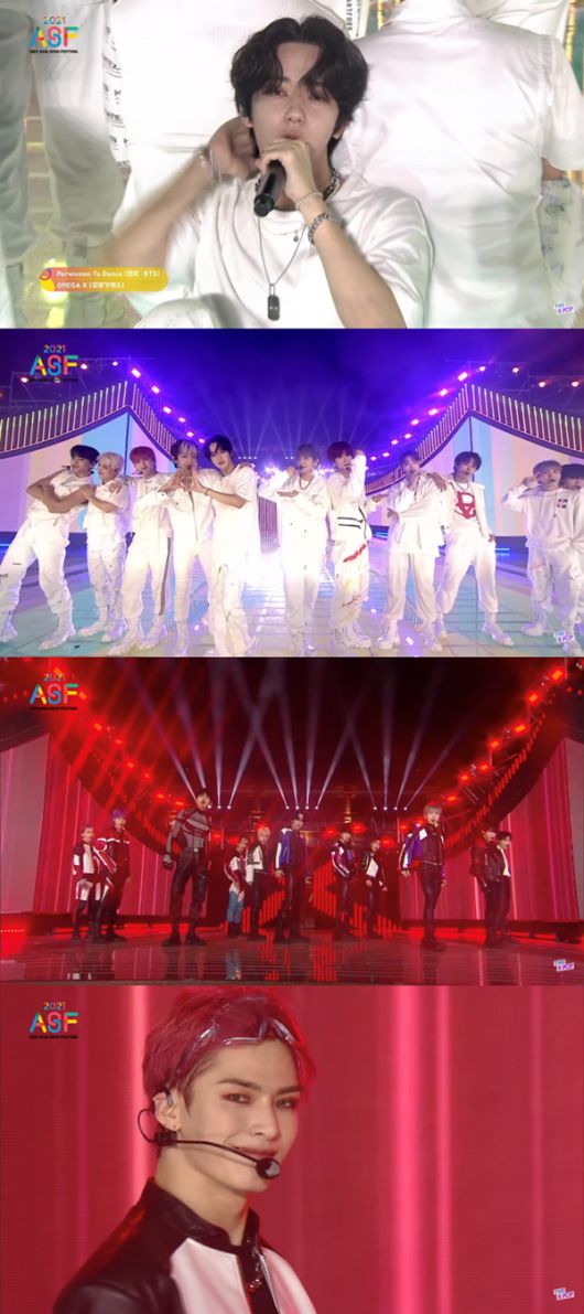 오메가엑스(재한·휘찬·세빈·한겸·태동·XEN·제현·KEVIN·정훈·혁·예찬)는 9일 오후 온라인으로 생중계된 ‘2021 아시아송 페스티벌 (이하 2021 아송페)’에 출연해 BTS(방탄소년단)의 ‘Permission to Dance (퍼미션 투 댄스)’와 첫 번째 싱글 타이틀곡 ‘WHAT’S GOIN’ ON (왓츠 고잉 온)’으로 메인 스테이지를 꾸몄다.