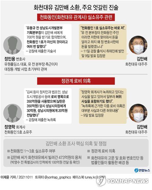 그는 실소유주 의혹이 제기된 천화동인 1호에 대해 "그건 바로 저"라며 "제기된 여러 의혹은 수익금 배분 등을 둘러싼 갈등 과정에서 특정인이 의도적으로 편집한 녹취록 때문"이라고 주장했다.