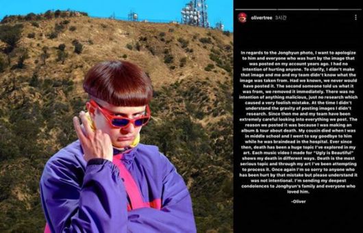 이에 올리버 트리는 스토리를 통해 장문의 사과글을 게시했다. 그는 "종현 사진에 대해 상처 받은 모든 사람들에게 사과하고 싶다"며 운을 뗐다.