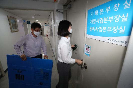 지난달 29일 자산관리회사 화천대유와 관련자들의 사무실 및 주거지 등에 대한 압수수색을 실시했다. 검찰관계자가 박스를 들고 성남도시개발공사 본부장실로 향하고 있다./연합뉴스 |