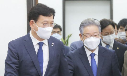 더불어민주당 제20대 대통령후보로 선출된 이재명 경기도지사와 송영길 대표가 11일 오후 서울 여의도 국회에서 열린 ''당지도부-더불어민주당 대통령 후보 상견례''에 입장하고 있다. 연합뉴스 |