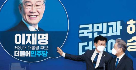 송 대표는 경선 불복 논란에 선을 그으면서 당을 후보 중심 선대위 체제로 전환하겠다는 뜻을 내비쳤다. 송 대표는 이날 국회 당대표실에서 이재명 후보와 만나 “이제부터는 경기도지사가 아니라 대한민국 집권 여당 대통령 후보가 됐다”며 “하루속히 지사직을 정리하고 예비 후보로 등록해서 본격적으로 선거를 준비해야 한다”고 했다. 민주당은 이날 당대표 실에 ‘이재명 민주당 제20대 대통령 후보, 국민과 하나로! 더불어 승리로!’라는 현수막도 걸었다.