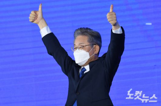 더불어민주당 제20대 대통령 후보에 선출된 이재명 경기도지사가 10일 오후 서울 송파구 올림픽공원 SK올림픽핸드볼경기장에서 열린 서울 합동연설회에서 두 손을 들어 인사하고 있다. 박종민 기자 |