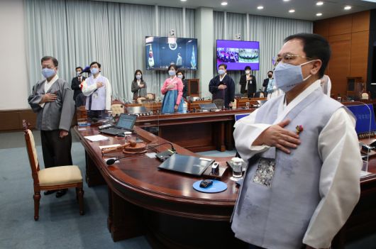[헤럴드경제=박병국 기자]문재인 대통령이 한복을 입고 국무회의를 주재했다. 국무위원들도 모두 한복을 입고 회의에 참석했다. 대통령과 각료들이 한복을 입고 국무회의를 진행한 것은 처음이다.
