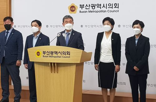 (부산=연합뉴스) 김재홍 기자 = 더불어민주당 부산시 구군의회 의장단 일동은 12일 부산시의회 브리핑룸에서 최근 기초의원과 관련한 이준석 국민의힘 당 대표 발언을 규탄하는 성명을 내고 사과를 촉구했다.