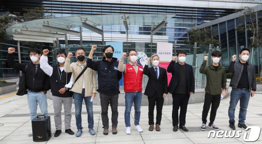 (서울=뉴스1) 권현진 기자 = 공공운수노조(이스타항공조종사지부)가 12일 오전 서울 서초구 행정법원 앞에서 ‘이스타 항공 부당해고 행정소송 제기 기자회견’을 열고 "악의적 정리해고를 정당화한 중노위 판정은 무효"라고 주장하고 있다.