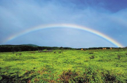 바로 옆 이승이오름을 가는 동안 무지개가 떴다. 무지개 아치 아래로 목장에서 풀을 뜯는 소들의 평화로운 모습이 사람의 마음까지 달랜다.