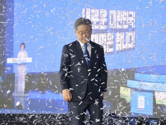 더불어민주당 제20대 대통령 후보에 선출된 이재명 경기도지사가 10일 오후 서울 송파구 올림픽공원 SK올림픽핸드볼경기장에서 열린 더불어민주당 서울 합동연설회에서 수락연설을 마치고 퇴장하고 있다. 연합뉴스 |